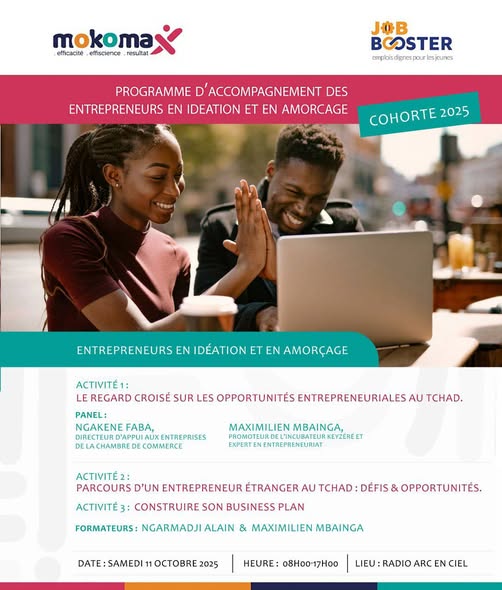 Le samedi 11 octobre 2025, nos jeunes entrepreneurs auront lโoccasion dโexplorer de nouvelles perspectives ร travers des รฉchanges inspirants sur les opportunitรฉs entrepreneuriales au Tchad, le parcours dโentrepreneurs รฉtrangers et la construction dโun business plan solide.